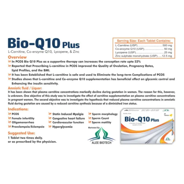 In PCOS, Bio Q10 Plus supports conception by improving ovulation quality, pregnancy rates, lipid profile, and BMI. The combination of L-carnitine and CoQ10 enhances insulin sensitivity and glycemic control while helping prevent long-term PCOS complications.