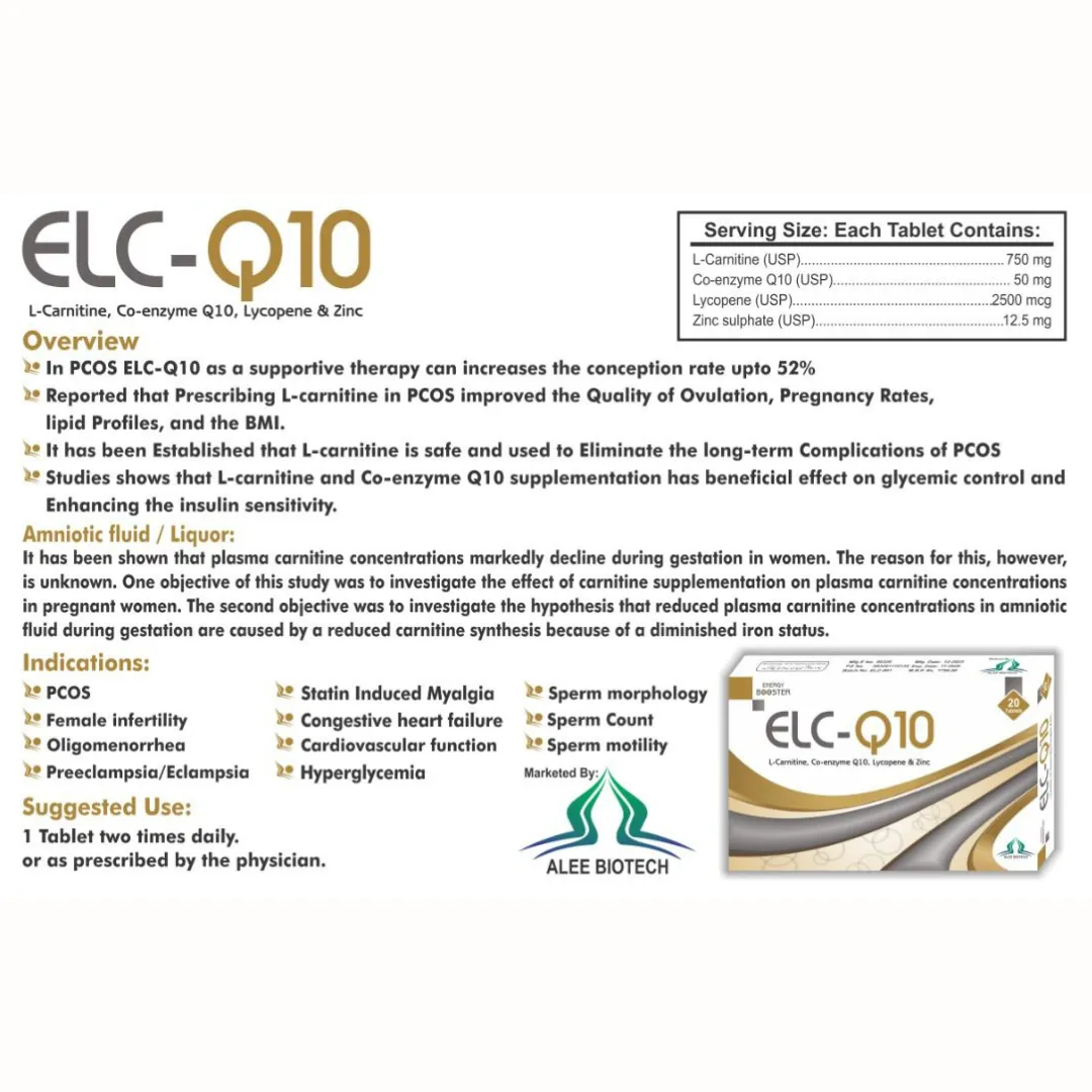 ELC-Q10 Plus supports women with PCOS by enhancing conception rates, improving ovulation quality, and balancing lipid profiles and BMI. Its L-carnitine and CoQ10 formula boosts insulin sensitivity and helps prevent long-term PCOS complications.